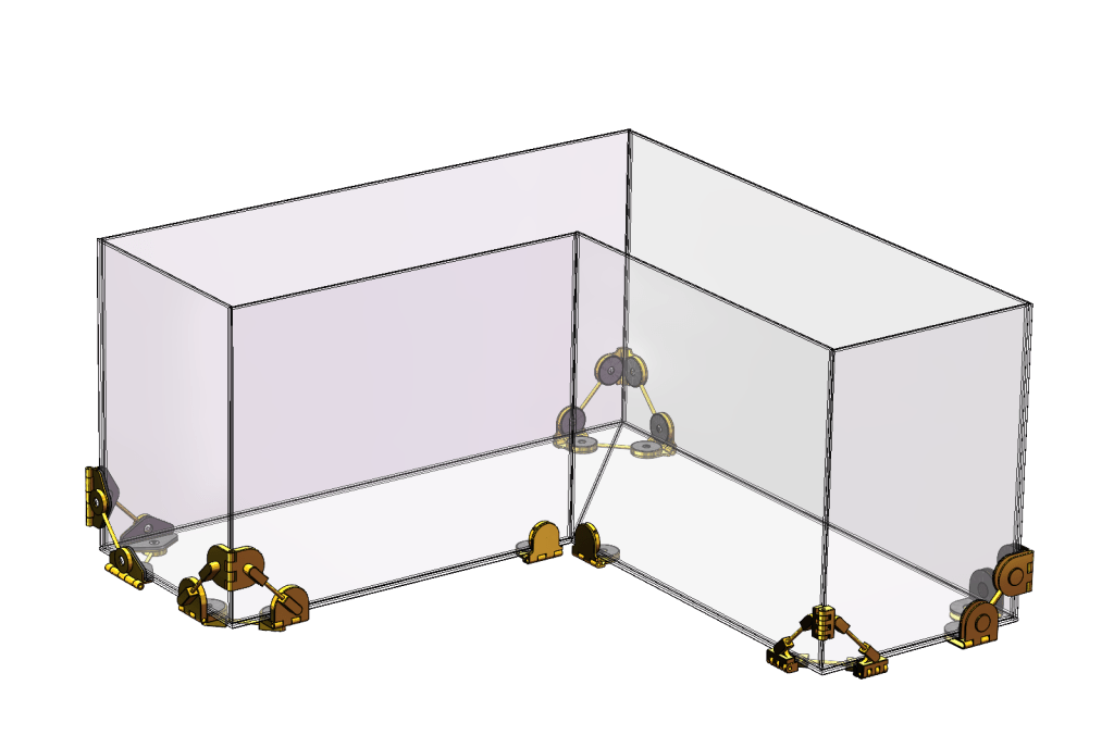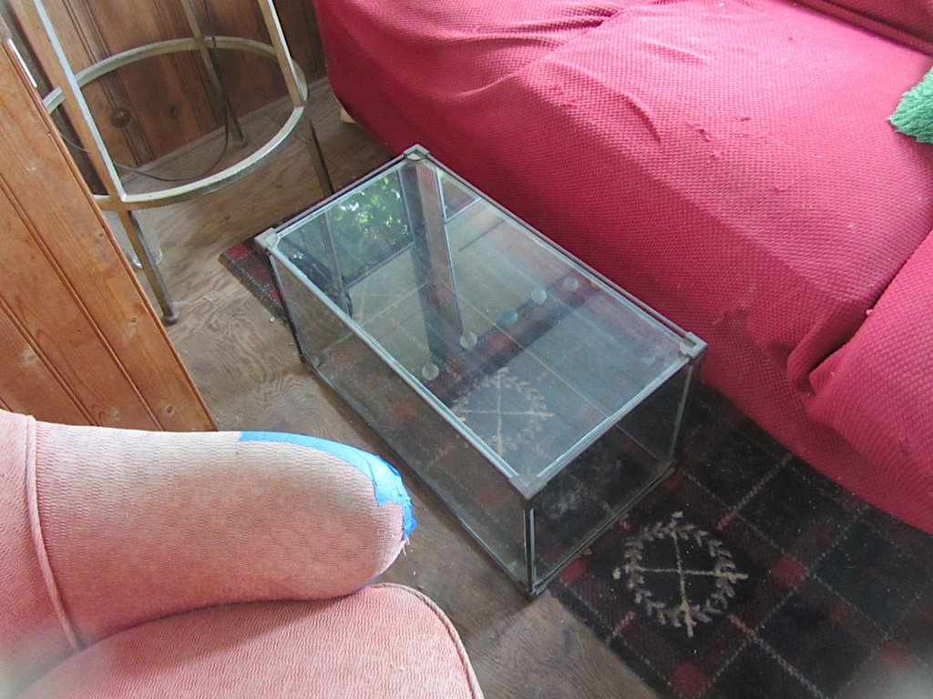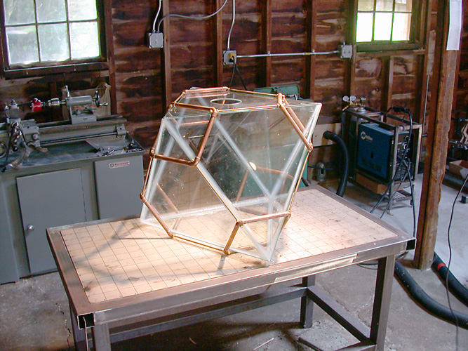 this is my first prototype, a 15 gallon tank. I think it took me exactly one month to make this. This has kicked around in various storage spaces for most of my life, and is now serving as a coffee table on a porch.This closeup of my first prototype shows my low skill-level at the time.I may not have know what a milling machine was when I began this project, so I made these two hubs by carving them by hand in jewelers wax, then having them cast by a company that specialized casting statuettes.The real strength of this method of making fish tanks was that it allowed the creation of unusual shapes, as well as suspension from a ceiling. I thought that a glittering glass and brass fish chandelier would be especially impressive.The connectors around the L-shaped tank represent several of the many of my attempts to design an easy-to manufacture, hinged hubs.This was one of the better designs, requiring a minimum of metal-work.hinged hubs being used on an octahedral tank.this is another idea for a tank that I thought might be feasible.Here are some cardboard cutouts of my first idea for hub for an octahedral tank. The blue one in the upper right was for the creation of a “tensegrity” tank using cables and turnbuckles.