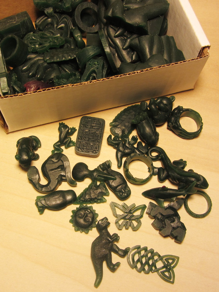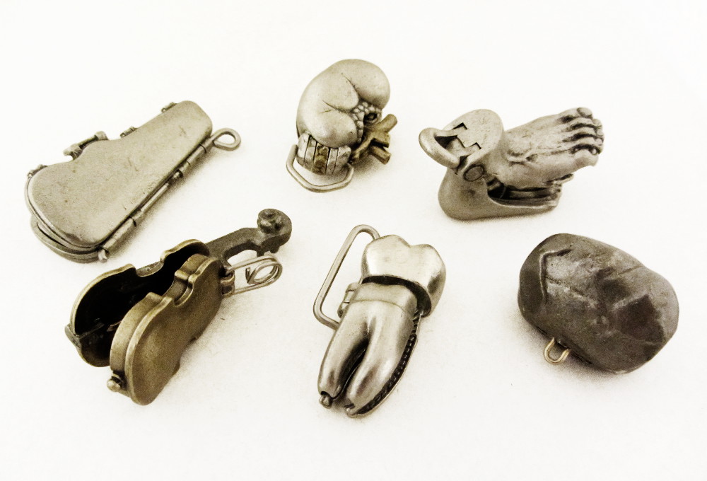 In preparation for carving my earliest items I made these sketches. On some you can see the grid I drew in order to transfer the designs to the wax.Here is a big box of wax carvings that didn’t make the grade. Each one represents many hours , days, etc. of painstaking whittling!Making things in real life is a lot less forgiving than doing the same work with CAD tools. I went through several iterations before I got a satisfactory mani-stone.The heart was my first locket-style item. Items from left to right are: 1) hand-carved heart keychain. 2) pewter casting of hand-carved heart (with enlarged loop). 3) duplicate pink waxes of the first heart made with a traditional Jewlers rubber injection mold (in upper left). I dropped this effort partway through. 4) The actual heart locket that I made years later using CAD and 3d printing.The submarine on the left was to be my first CAD-only design, but in the end I wound up carving the piece by hand. Later, when it came time to make the sub’s mother ship (with all of its little portholes etc., I got partway into carving it, and decided that it was time to try the CAD way… and so the ship on the right is my first computer generated piece.The process of transitioning from hand-carving to CAD-modeling was fraught with difficulties… The large ship in the back is a 3d print in which I forgot to specify metric units!For years, I have done contract design work using several CAD packages, experience that came in handy as the locket-style pieces became increasingly complex!Since my first locket style item (the heart locket introduced in 2010), I have used a lot of variations on the design of the hinge.One technical issue encountered in the early days of 3d prints, was the inability to withstand the vulcanized rubber molding process.Click on the link below to see the in-depth account of the creation of one of my more complex pieces, the Anatomical Eye Keychain.